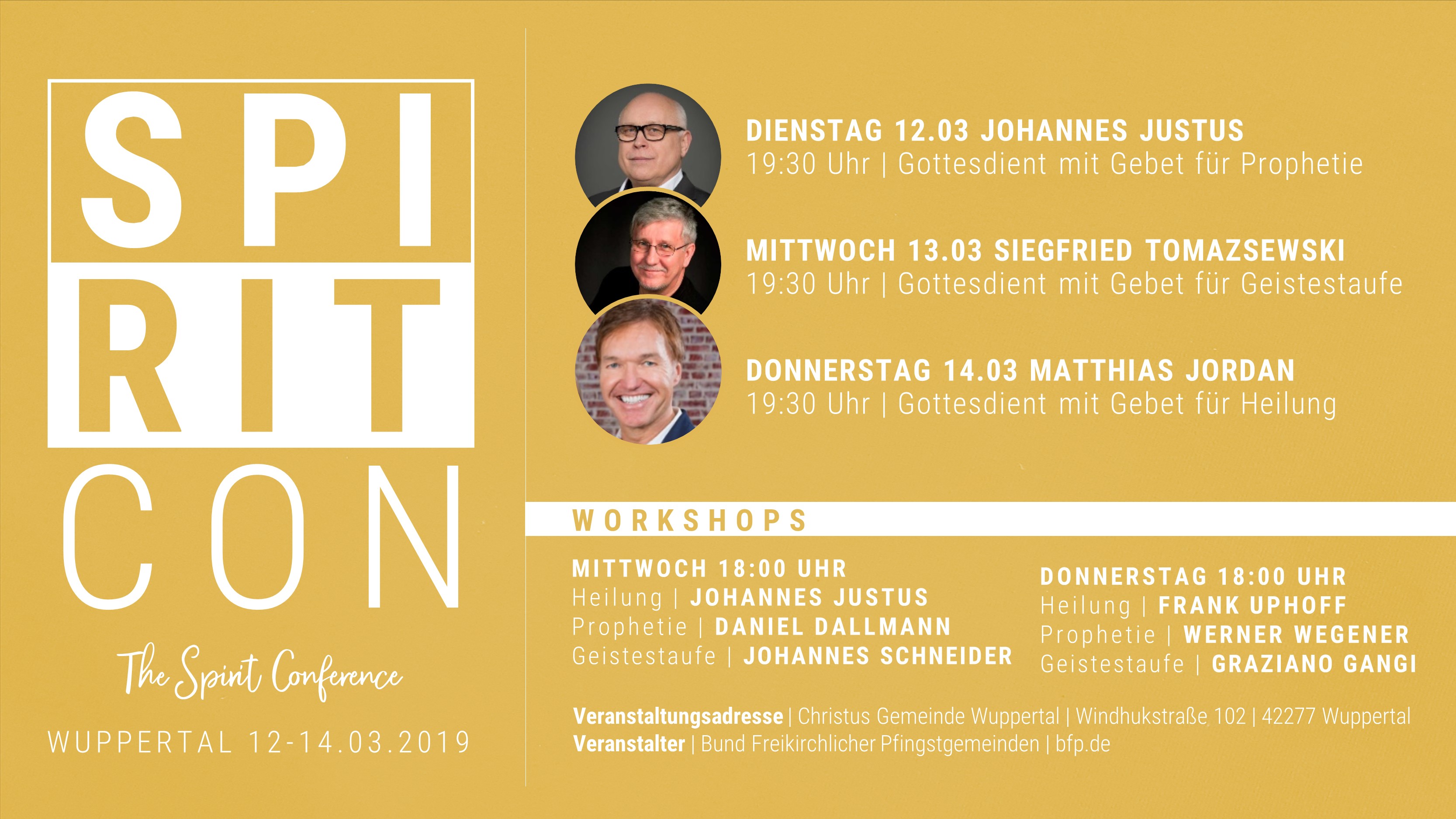 Den Auftakt macht dazu die SpiritCon in Wuppertal (12. - 14.03.19). „Als Gastsprecher haben BFP-Präses Johannes Justus, Siegfried Tomazsewski (USA) und Matthias Jordan (Kassel) für die Abend zugesagt“, erläutert Daniel. Dazu kommen Seminare und Workshops. Der Schwerpunkt der Konferenz sind die Themen Taufe im Heiligen Geist, Geistesgaben und Heilungsdienst.